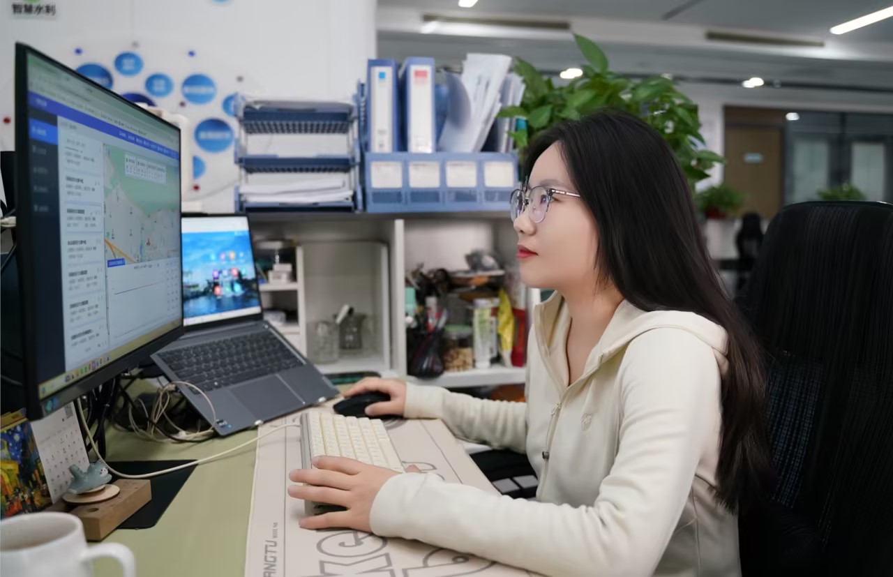 “把‘我不会’变成‘我可以学’,就没有跨不过的坎。”接手城市运行管理服务平台项目后,李杉杉积极对接协调执法局、道桥所、指挥保障中心等多个部门;面对技术瓶颈与内部协作,她善用“技术+管理”寻找最优解,实现“工期、成本、质量”三者平衡。那段时间,她办公桌上的草稿纸写满一摞又一摞,电脑屏幕同时打开多个网页、文档,红色标注技术难点、蓝色梳理逻辑框架、黑色记录经验总结,活脱脱画出一张“技术攻坚地图”;她逐页学习数字化城市管理国家标准,连续多日调试数据,用通俗的“叠被子”比喻向团队成员拆解核心逻辑,“人口、事件、资源就像三层被单,层层理顺、精准叠加,城市运行就能更顺畅”。这种“先吃透、再分享”的钻研精神,逐渐形成部门不成文的规矩——遇到新技术先自主攻坚,再通过“技术分享会”全员赋能,“杉杉式成长”成为团队共同的追求。