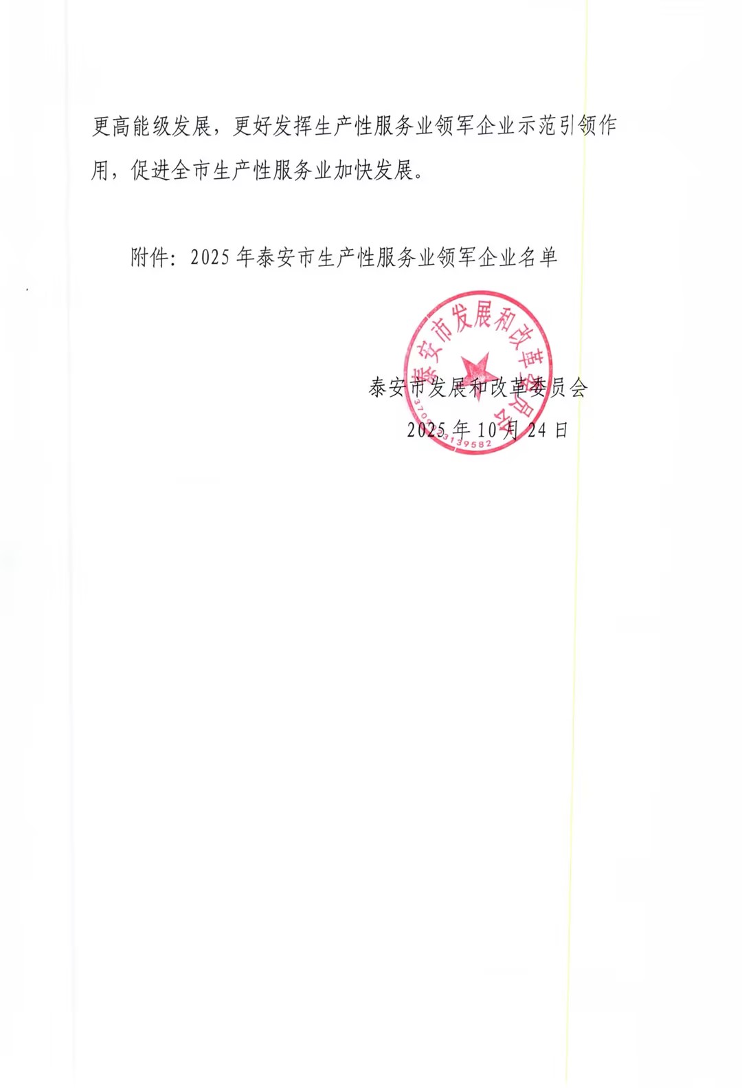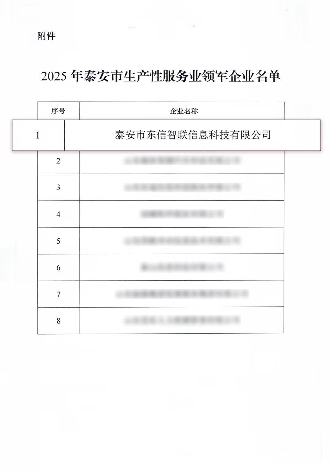 近日,泰安市发展和改革委员会正式发布了《关于公布2025年市级生产性服务业领军企业名单的通知》,泰安市东信智联信息科技有限公司凭借其在生产性服务领域的卓越表现与创新实力,成功入选2025年泰安市生产性服务业领军企业名单。